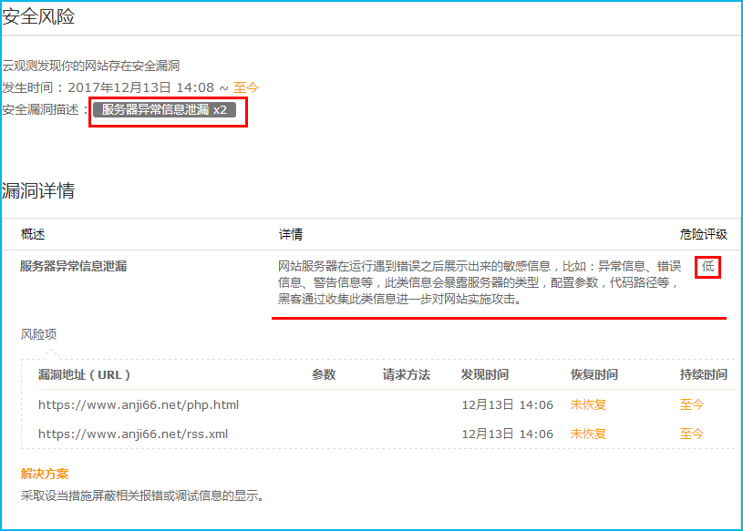 从11月底运行,云观测一直提示系统安全,未发现问题。直到前天一条莫名的短信提醒报网站存在安全漏洞,具体的是底等级的风险服务器异常信息泄露。
